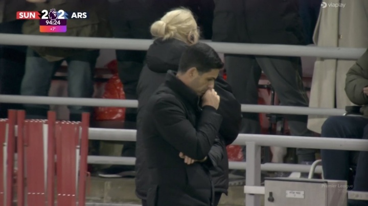 11月9日讯 阿森纳本轮2-2战平桑德兰,补时桑德兰绝平,场边镜头给到了阿尔特塔。