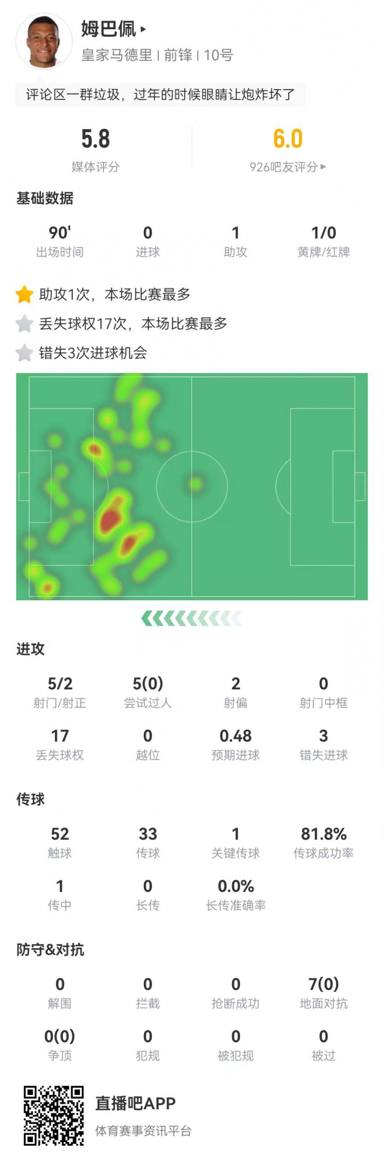 2月18日讯 皇马在本轮欧冠对阵本菲卡,姆巴佩本场数据如下: